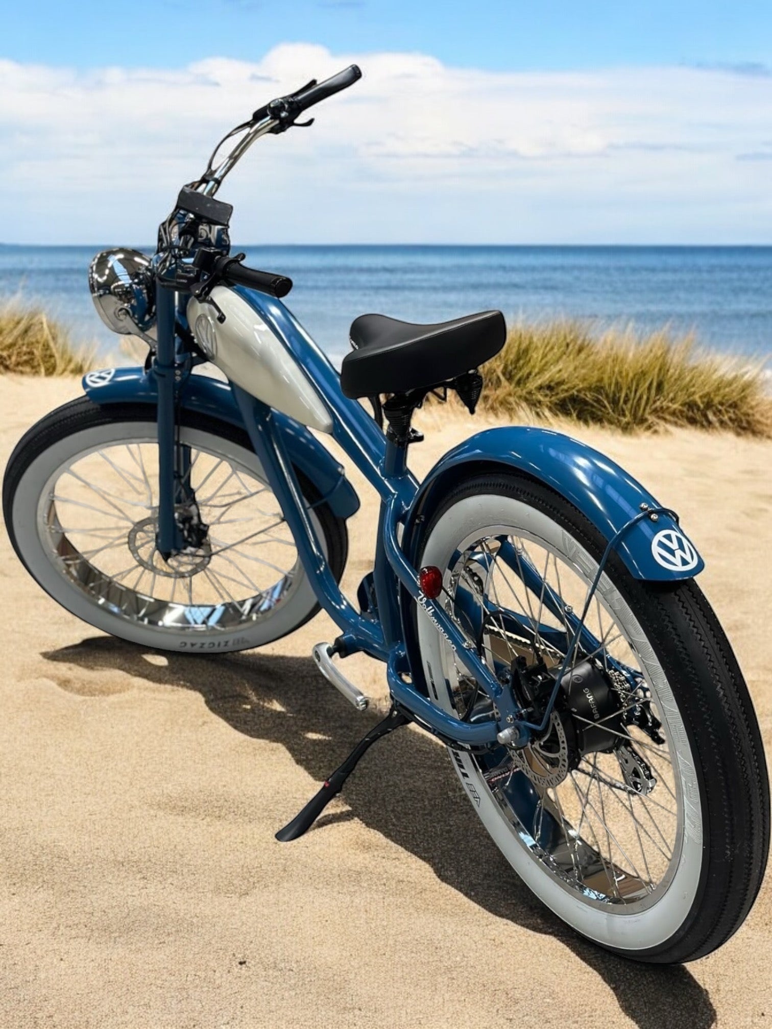 Dieses Bulli Bike verkörpert höchste Verarbeitungsqualität und eine Liebe zum Detail, die jeden Fan begeistert. Ob das klassische Design in Sambablau / Weiss oder die sorgfältig ausgewählten Materialien – jedes Element wurde mit Präzision gefertigt, um Mobilität auf ein neues Level zu heben. Ein Bike, das nicht nur überzeugt, sondern inspiriert.