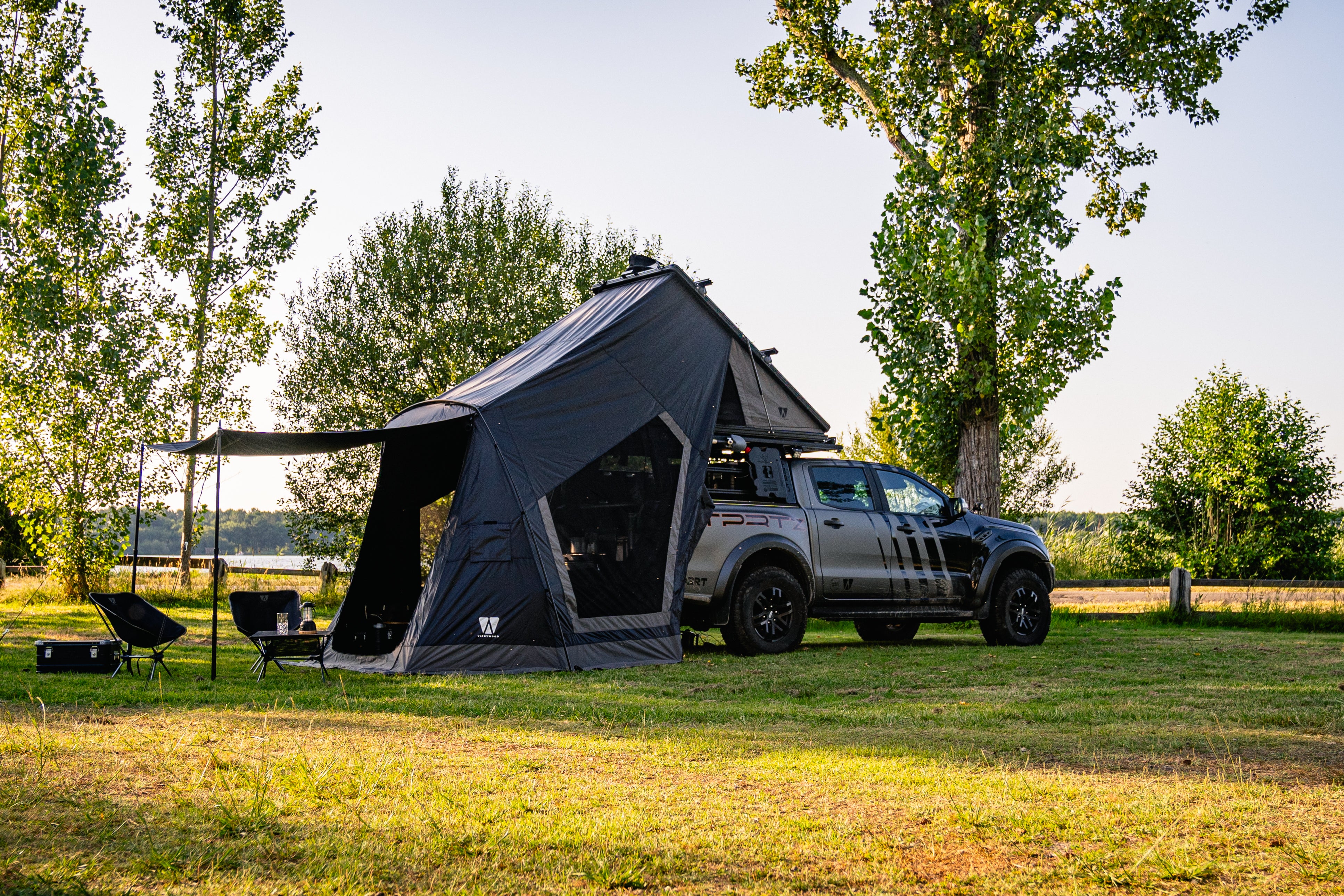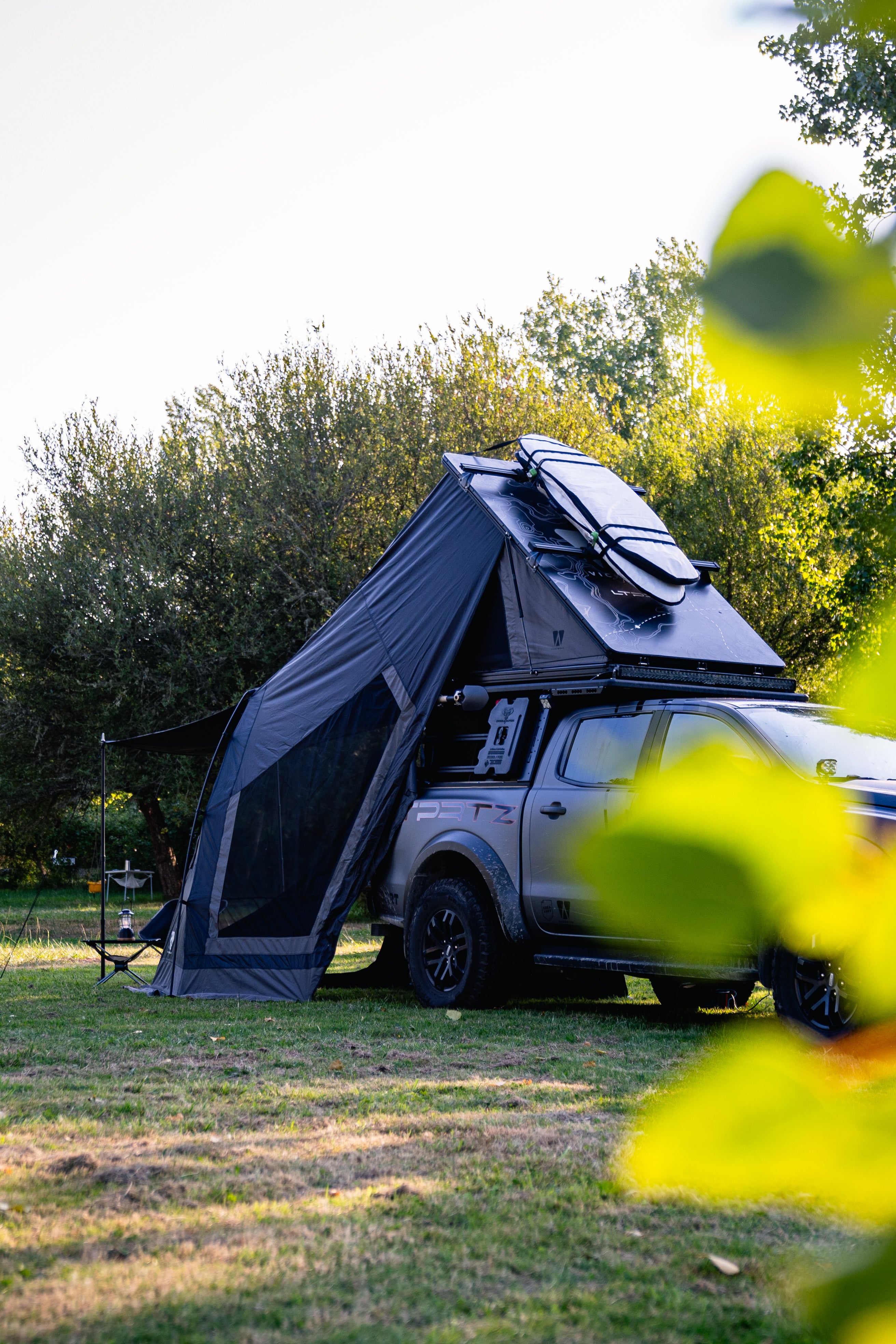Das praktische Vorzelt für das CUMARU LIGHT bietet dir einen geschützten Vorraum hinter deinem Fahrzeug, sodass du trocken in dein Zelt gelangst und deinen Küchenauszug oder ähnliches nutzen kannst.